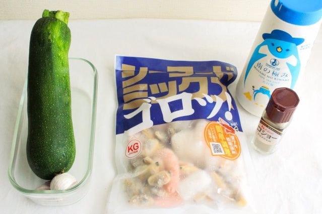 今回作ってみる「シーフードミックスとズッキーニのにんにく炒め」は、冷凍シーフードミックス、ズッキーニ、にんにく、塩、こしょうだけで作れる炒め物。冷凍シーフードミックスは下処理の必要がないので、気軽に使えるのもポイントですね。