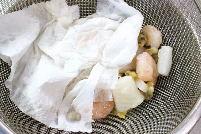 1. ボウルに張った水(分量外)にシーフードミックスを入れて、サッと混ぜます。ザルに上げて、キッチンペーパーで水気をしっかりと拭き取ります。