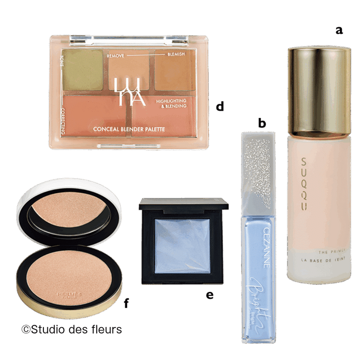 a SUQQUのザ プライマー b CEZANNEのブライトカラーシーラー 10 d LUNAのコンシールブレンダー パレット01 CLEAR COVER e shu uemuraのアンリミテッド ルミマット セッティング ジェル イン パウダー アオタケブルー f HERMÈSのエルメス プラン エア プードル エクラ グロー 02 ミラージュ