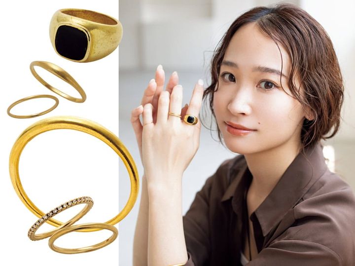 「基本ゴールド派で、華奢なフォルムとぷっくりボリュームのあるデザインを組み合わせて抑揚をつけるようにしてます。凛とクラシックな要素が際立つ、ブラックのストーンやタッセルネックレスの強さも、ゴールドとのコンビで洗練された印象に」