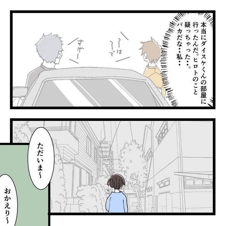 (あ・・本当にダイスケくんの部屋に行ったんだ。ヒロトのこと疑っちゃった・・。バカだな・・私・・)ヒロトの言葉を疑って後までつけてしまった自分を恥じつつ、二人が部屋に入って行く様子を見て私はホッとして家に帰りました。ヒロトたちが「ただいま~」と言って帰った部屋から「おかえり~」と女性の声がしていたことも知らず・・。