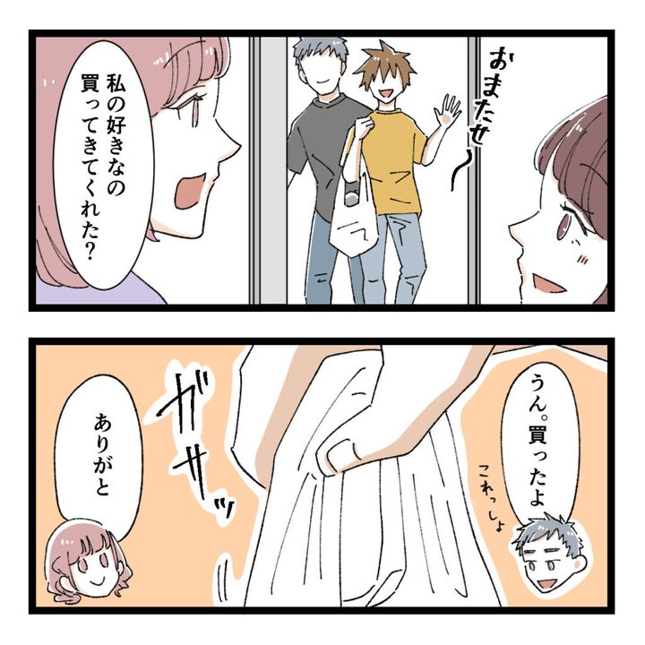 ヒロトさんとダイスケさんが「おまたせ~」と言いながら部屋に入ると、ダイスケさんの彼女リサさんが「私の好きなの買って来てくれた?」と確認。「うん。買ったよ。これっしょ」と言って買ってきたものを渡すと「ありがと」とリサさん。