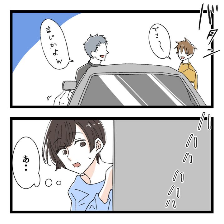 ヒロトは結婚式場の下見予約をすると言ってくれたけれど、1週間経っても予約はしておらず、週末は男友達のダイスケくんたちと会う約束があると言って出かけてしまいました。最近出かけることが多くなったヒロトに不安を感じた私は、いてもたってもいられなくなりダイスケくんの家の近くまで来てしまいました。「ここまで来ちゃった・・帰ろうかな。どうしよう・・。でも・・確かめてから・・」と葛藤していると、一台の車が停まるのが見えました。