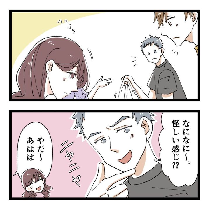 ダイスケさんの家に行くと言って出かけたヒロトさんを疑う気持ちが拭えず、こっそりダイスケさんの家まで確認に行ってしまったマイさんが見たのは、楽しそうに二人で部屋に入って行くヒロトさんとダイスケさんの姿。マイさんはホッとして家に帰りましたが、実はダイスケさんの部屋には女性が二人。一人はダイスケさんの彼女リサさん。そして、もう一人は・・ヒロトさんがマイさんに隠れてデートをしていたアユミさんでした。ヒロトさんとアユミさんの間に流れる微妙な空気を感じてダイスケさんがからかうと、アユミさんは笑って流しました。