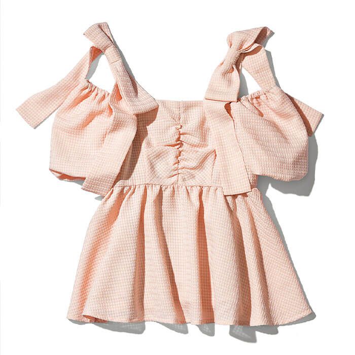 ショルダー&リボンが取り外し可能。ほんのり透け感のあるチェック柄で愛らしく。