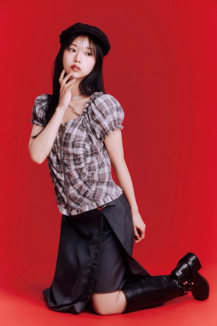 黒ハンチング帽 5,500円/kaorinomori(OVERRIDE ルミネエスト新宿)チェック柄ブラウス 5,390円/OLIVE des OLIVE グレースカート 9,790円/Narcissus ブーツ 29,700円/ASRA(HANA KOREA)