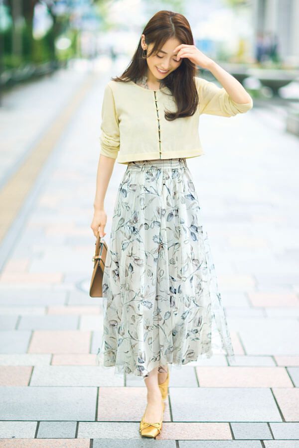 柄があるぶん、カーデはなじんで見えるよう無地で。透け感があるものなど、素材でひねりを加えるとこなれ見えします♪ 前を閉じても、インにほんのりと花柄を感じられるのがシアーカーデの醍醐味。クリームイエローを選べば、ワンピの地色にするりとなじんでワントーン風に。