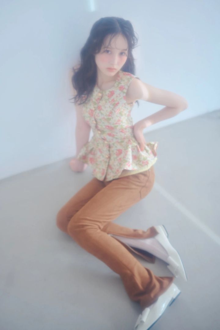花柄トップス 27,280円/ドリーム シスタージェーン(ザ・ウォール ショールーム)キャメルスエードパンツ 8,910円/MURUA ハイソックス 1,100円/靴下屋(Tabio)パンプス 12,900円/チャールズ&キース(チャールズ&キース ジャパン)