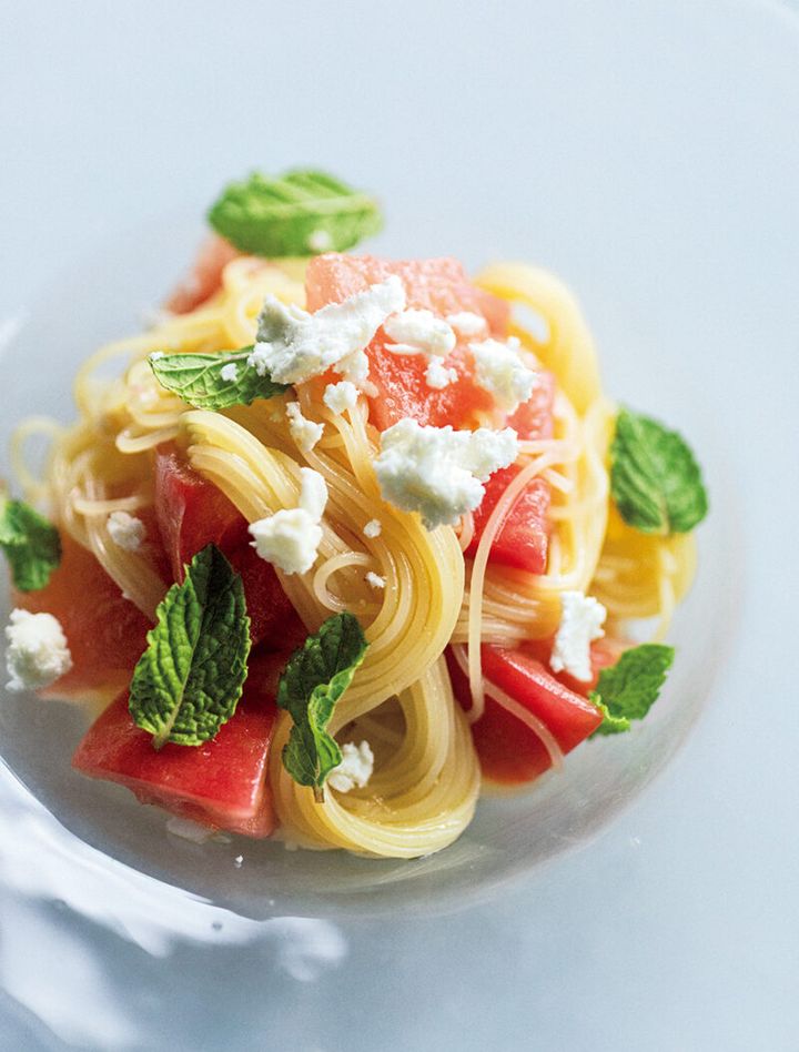 すいかの甘みとミントの風味にチーズのコクがアクセント 「すいかとトマトのカッペリーニ」