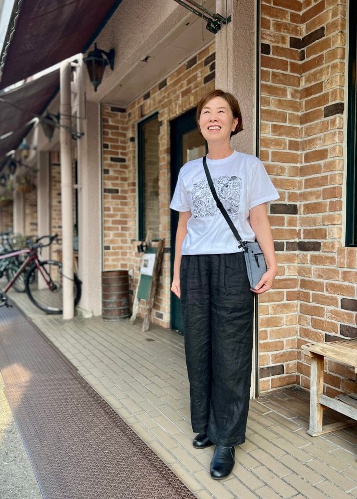クールなイラスト入りのTシャツに「無印良品」のリネンのワイドパンツというカジュアルな出立ち。「朝はピンクのサマーニットで出かけたんですけど、京都市京セラ美術館に草間彌生展を観に行ったらすごく素敵で、ミュージアムショップで買ったTシャツに早速着替えました」。「普段は暗めの色が好きなので、バッグなどの小物で明るい色を取り入れるように工夫しています」。