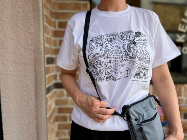 Tシャツは「草間彌生 版画の世界―反復と増殖」展のミュージアムグッズ。「愛はとこしえ」と名付けられた絵画シリーズは、カラフルな作品を多く発表している草間彌生の作品の中にあって、モノクロで描かれたドローイングがクールな印象を与える。
