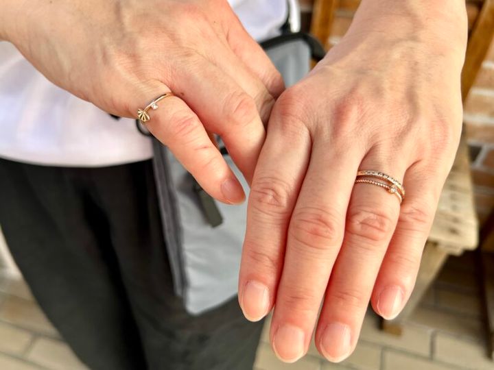 左手は「結婚10周年の時に主人からもらった指輪に、ジュエリーショップでずっと気になっていて自分で購入した指輪を重ねています」。右手のピンキーリングは「ete(エテ)」。こちらは、この日も一緒にお出かけされていたお母様と妹さんからのプレゼントなのだとか。