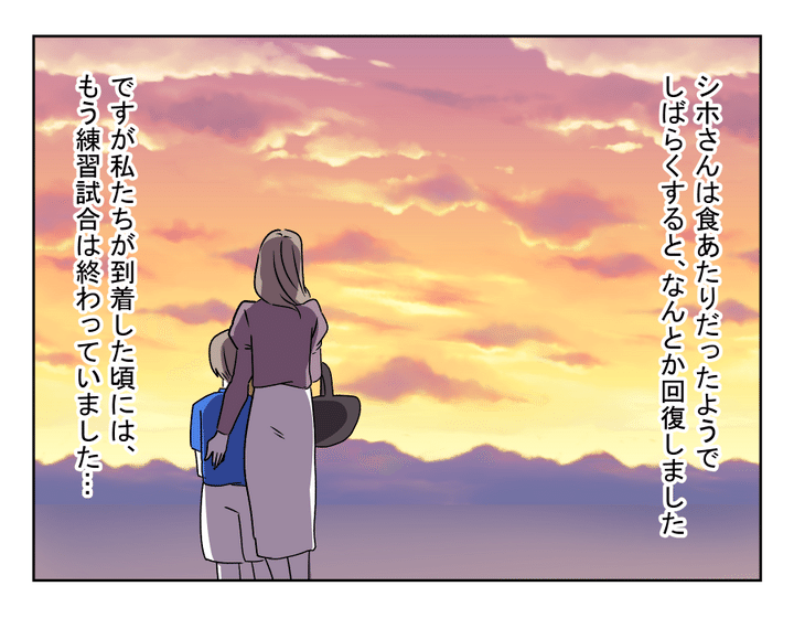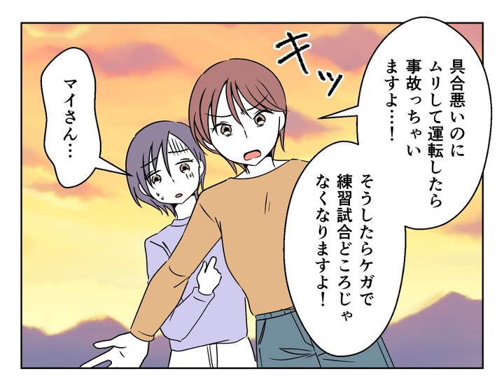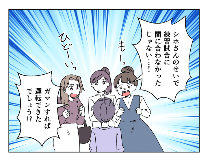 マイさんの息子リュウキくんは、サッカーを習っています。しかし練習の車送迎で、ボスママ・スズネさんとモメてしまい、マイさんは陰口をたたかれるようになってしまいました。そんなある日、練習試合にスズネさんと息子レイナくん、そしてシホさんと息子ハルトくんが来ません。みんながザワついていると、スズネさんからコーチに電話がきて、車送迎を頼まれたシホさんが運転中に体調を崩して運転できなくなってしまったと知ります。