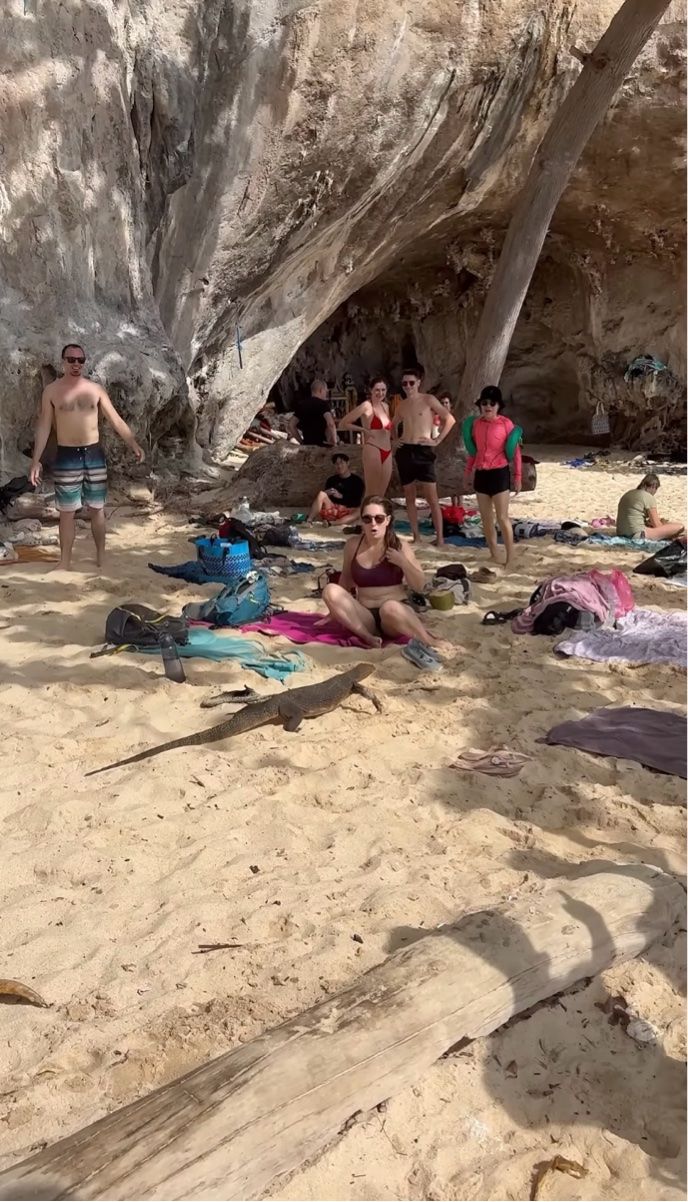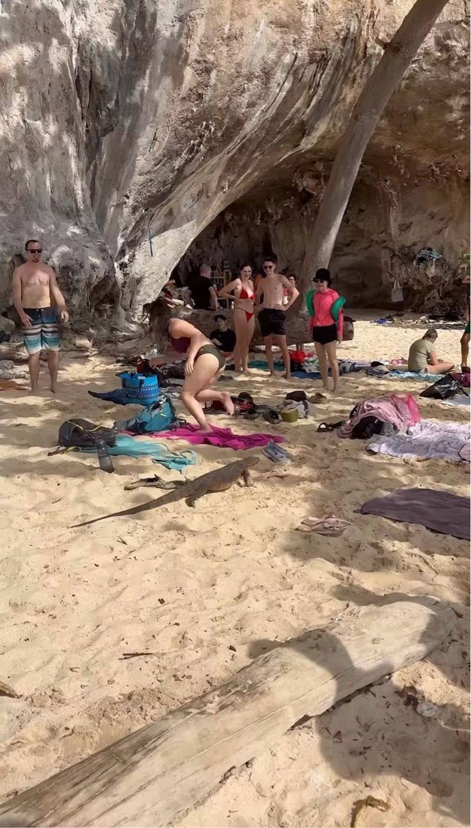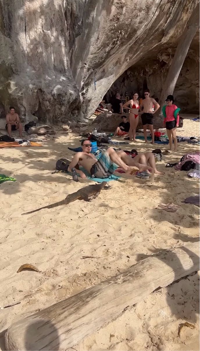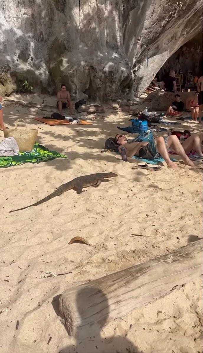 動画の撮影されたタイでは、首都バンコクにもオオトカゲが生息しているといいますが・・・。 このクラビのビーチも生息地なのでしょう。
