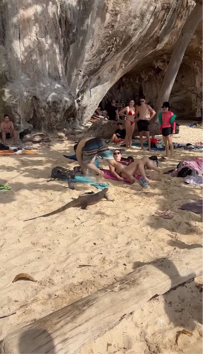 ビーチで日光浴を楽しんでいた観光客を驚かせたオオトカゲ。 そのハプニングの様子は、こちらの動画からご覧いただけます。