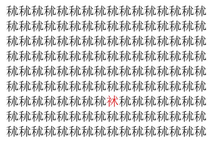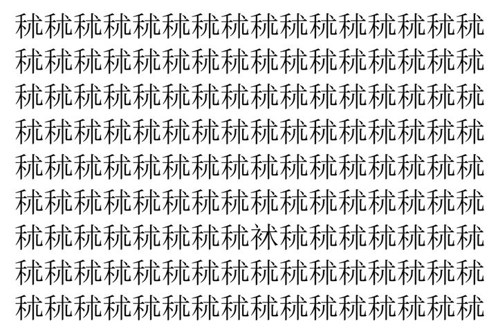 画像の中には、「秫」という漢字が縦に9行、横に16個並んでいます。 全部で144個となりますが・・・、そのうち1つは「異なる漢字」となってますよ!!