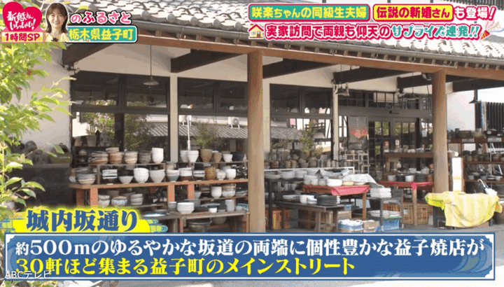 2か所目は、益子町のメインストリート『城内坂通り』。500mに渡り、益子焼のお店がずらりと並ぶ。年に2回の陶器市には、全国から60万人が訪れ、にぎわいをみせるという。