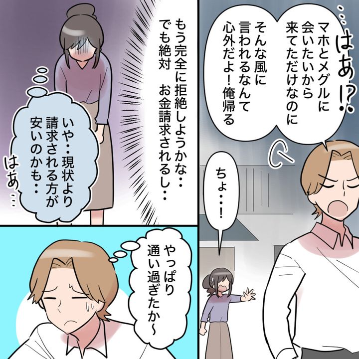 「・・はあ!?マホとメグルに会いたいから来てただけなのに、そんな風に言われるなんて心外だよ!俺帰る」そう言ってさっさと帰ろうとするオサムさんに、「ちょ・・!」マホさんは声をかけるも、「もう完全に拒絶しようかな・・でも絶対お金請求されるし・・」と思いつつ「いや・・現状より請求される方が安いのかも・・はぁ」と呟きました。その頃オサムさんは、「やっぱり言い過ぎたか~」と自分がしたことを後悔していました。