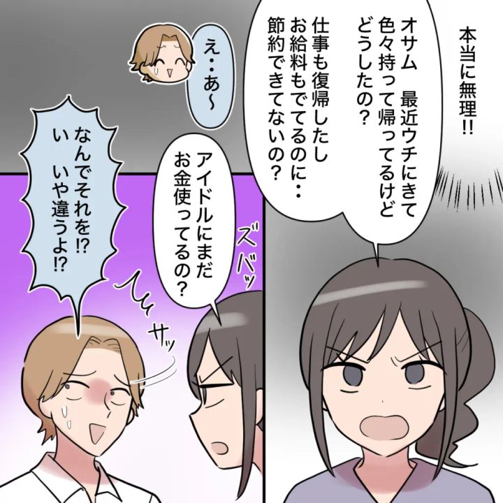「本当に無理!!」そう思ったマホさんは、「オサム、最近ウチに来て色々持って帰ってるけどどうしたの?仕事も復帰したし、お給料も出てるのに・・節約できてないの?」と怒りながら聞くと、「え・・あ~」と言葉を濁すオサムさん。「アイドルにまだお金使ってるの?」とズバリ聞くと、「なんでそれを!?い、いや違うよ!?」としらばっくれて答えました。