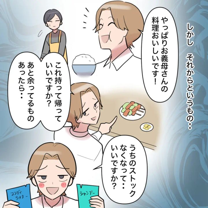 「やっぱりお義母さんの料理おいしいです!」と食事を食べに来たり、「これ持って帰っていいですか?あと余っているものあったら・・」とおかずを持ち帰ろうとしたり、「うちのストックなくなって・・いいですか?」とシャンプーやコンディショナーまで持ち帰ろうとしました。