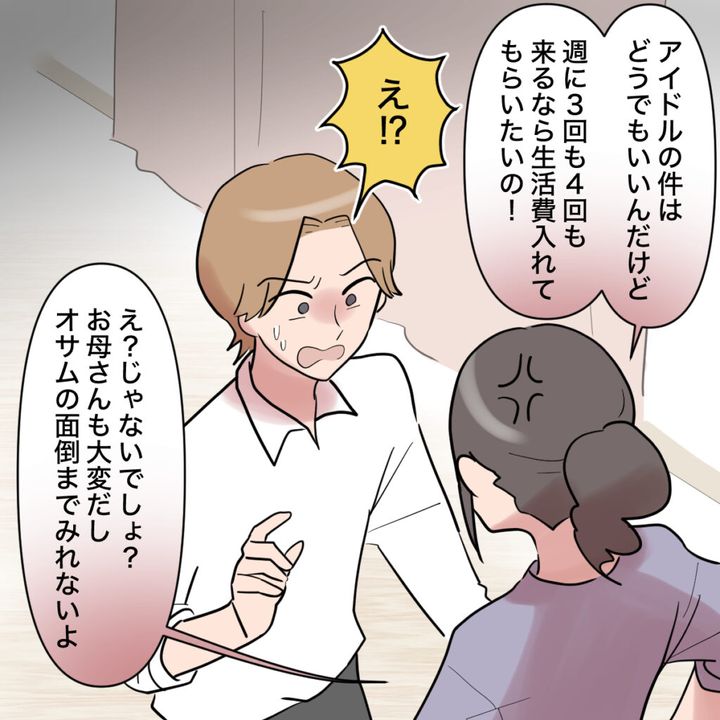 「アイドルの件はどうでもいいんだけど、週に3回も4回も来るなら生活費入れてもらいたいの!」マホさんの言葉に「え!?」と驚くオサムさん。「え?じゃないでしょ?お母さんも大変だし、オサムの面倒までみれないよ」マホさんがそう言うと、
