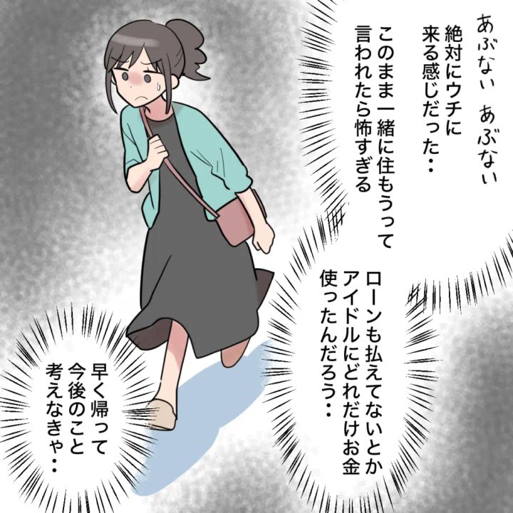 「あぶないあぶない。絶対にウチに来る感じだった・・。このまま一緒に住もうって言われたら怖すぎる。ローンも払えてないとか、アイドルにどれだけお金使ったんだろう・・。早く帰って今後のこと考えなきゃ・・」と考えながら実家へと急ぎました。