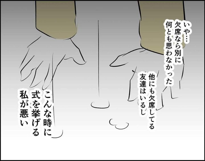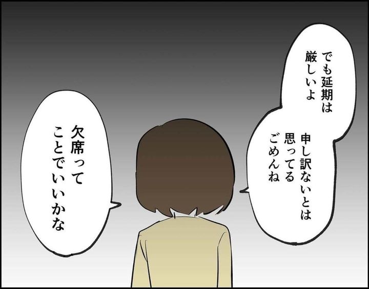セミさんは自分たちが式を挙げた時期が時期だけに「欠席はやむなし」と思っていました。しかし式の10日前に「延期にできないか」と言われるのは困ったでしょうね。出席者がセミさん夫婦と世羅・星佳だけならまだしも、多くの人に予定を組んでもらっているイベントを2人の都合だけで延期にするのはさすがにできませんよね。