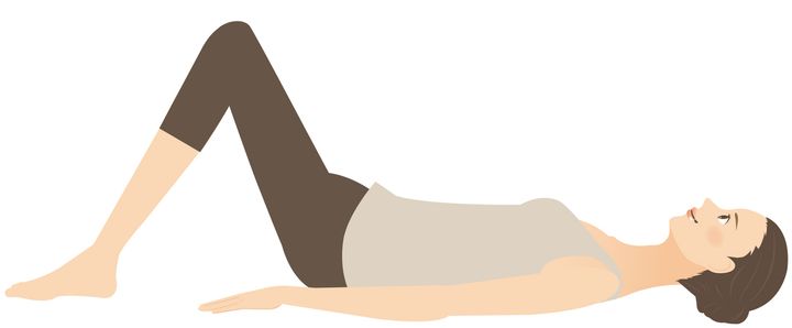 (1) 仰向けに横になり、両ひざを軽く立てて肩幅程度に開く