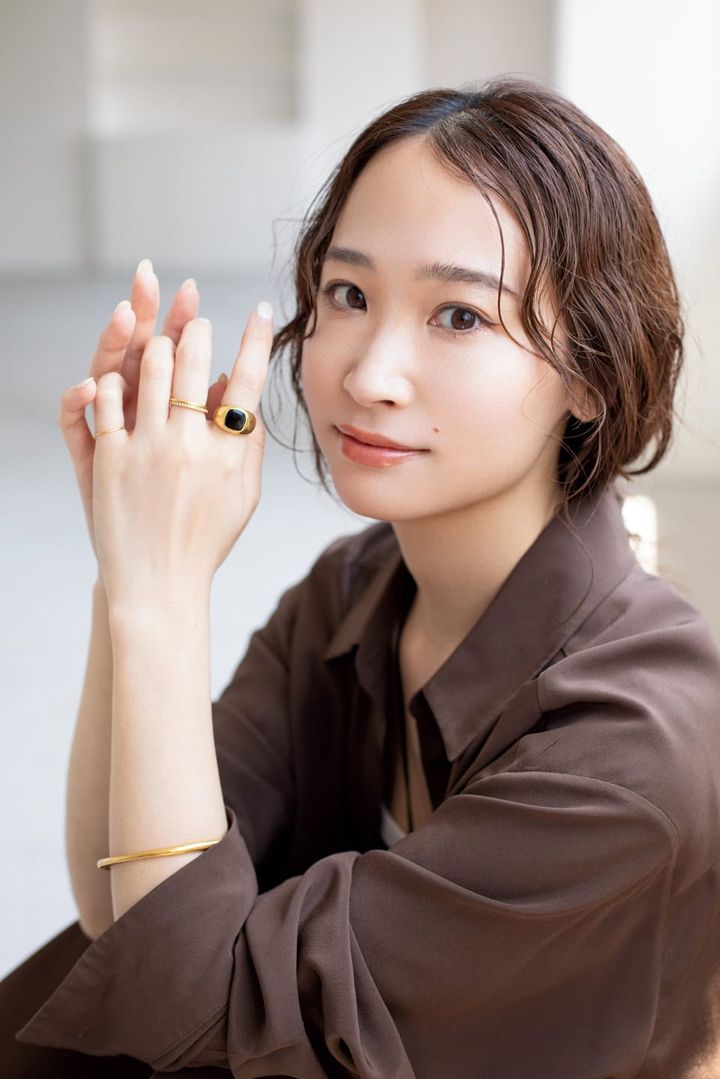 「基本的にゴールド派で、華奢なフォルムとぷっくりボリュームのあるデザインを組み合わせて抑揚をつけるうにしてます。凛とクラシックな要素が際立つ、ブラックのストーンやタッセルネックレスの強さも、ゴールドとのコンビで洗練された印象に」人差し指にしたLOROのリング、中指にしたLaainaのダイヤのリングとLOROのリング 、小指にしたGIGI JEWELRYのリング、Casa Ayllónのネックレス、Gabriela Artigasのブレスレットは全て本人私物