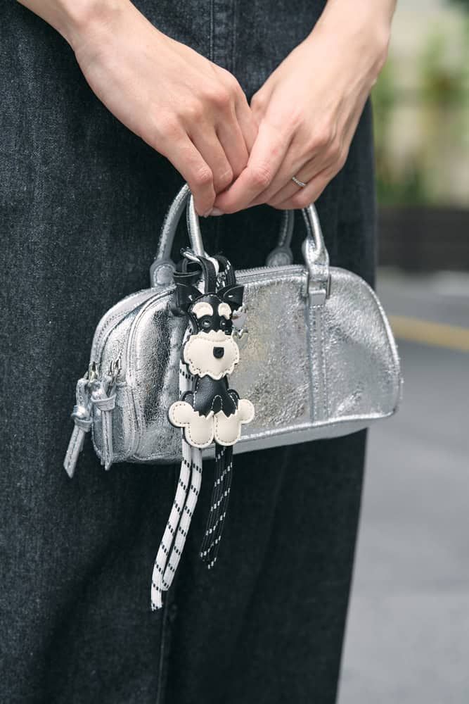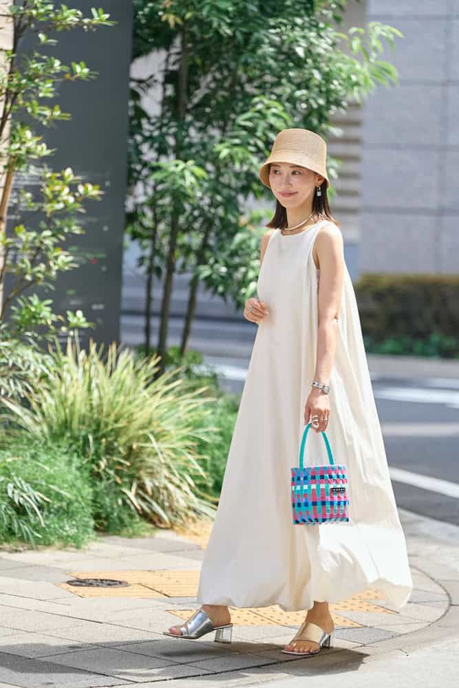 裾に広がるバルーンシルエットが魅力のワンピース。アメリカンスリーブが程よくヘルシーな印象にしてくれます。真夏の暑さにもぴったりな爽やかな白を選びました。バッグはマルニのキッズラインのもので、カラフルな色使いが元気をくれるうえ、意外に収納力もあり、雨や湿気の多い日にも安心して使える万能アイテム。ワンピースがシンプルなので、アクセサリーは大ぶりなシルバーをチョイス。帽子やサンダルの存在感もプラスしコーデに奥行きを持たせています。