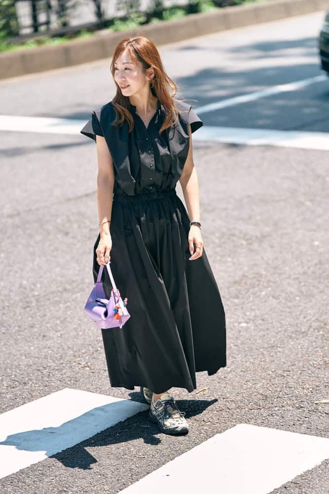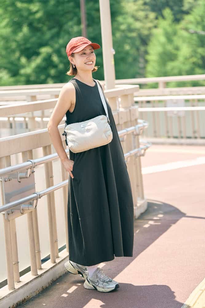 UNIQLOのワンピースは、体のラインを拾わないゆったりとしたシルエットで、さらりと快適に着こなせます。重たく見えないように、白ソックスと存在感のあるスニーカーを合わせてバランスを調整。靴とマルジェラのバッグは同系色で統一し、赤いキャップを差し色に加えることで、全体にメリハリのあるスタイリングに仕上げました。