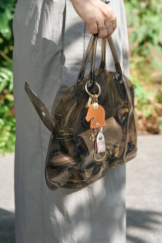 トレンチ風のワンピースは、裾の広がりや印象的なバックデザインが魅力。背中はケープデザインになっていて、ちらりとのぞく素肌がヘルシーな抜け感が出せます。PVC素材で夏らしいバッグはウサギの耳がついていてさりげない可愛さを。落ち着いたブラウンカラーが大人っぽさを意識しつつ、大きなリボンが目を引くサンダルで華やぎを添えれば、ご近所でも浮かない夏の上品可愛いコーデが完成します。