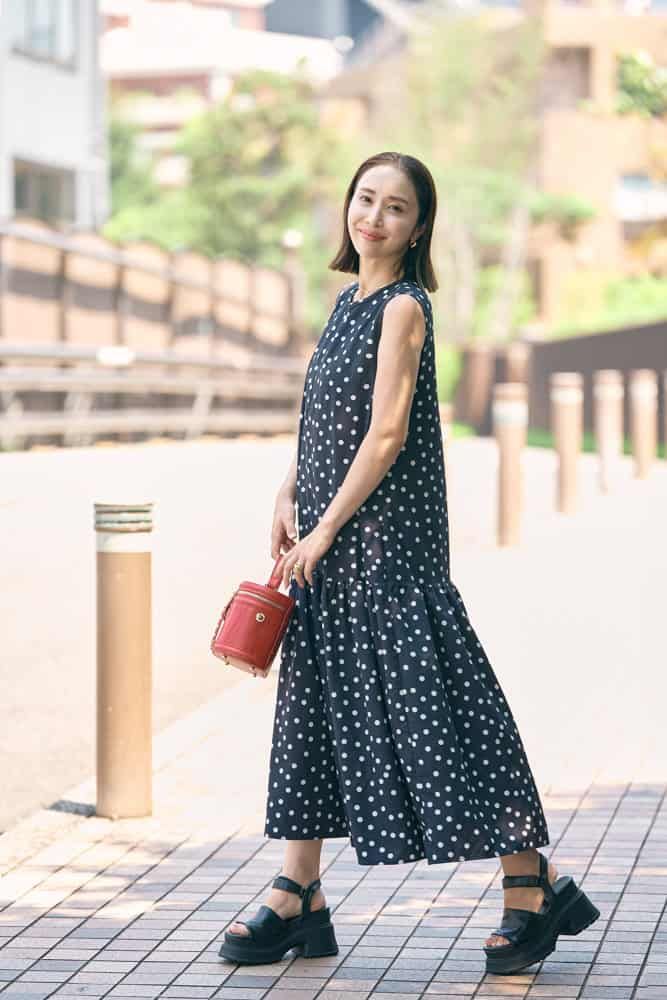 ドットワンピースはとにかく楽ちんなのに、涼しく一枚で華やか見えするので、夏の暑い日やコーデに迷った日の救世主!赤のバッグを差し色に入れるだけで、ぐっと可愛さもアップします。足元は走れるサンダルで動きやすさを。ご近所でも気軽に楽しめる、カジュアルコーデに仕上げました。