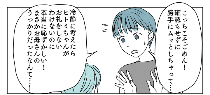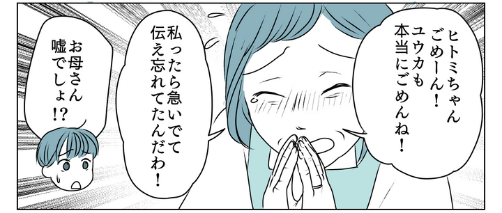 自分のうっかりだったことに気づいた義母は、私と、ユウカさんに対しても謝罪してくれました。ユウカさんは「嘘でしょ!?」と呆れた顔をしています。