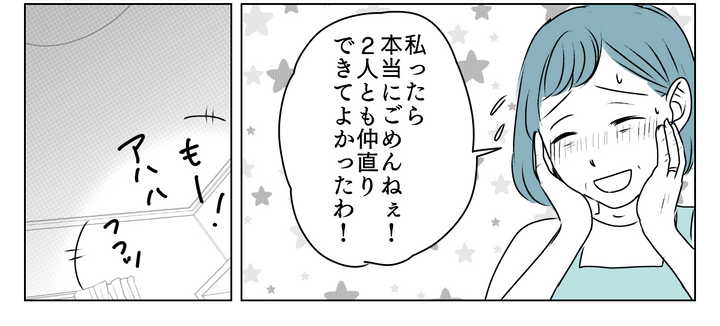 それぞれの誤解が解けて、私たちは謝罪合戦に。張り詰めていた空気が一気に和らぎ、義母を含めた3人で顔を見合わせて笑い合いました。