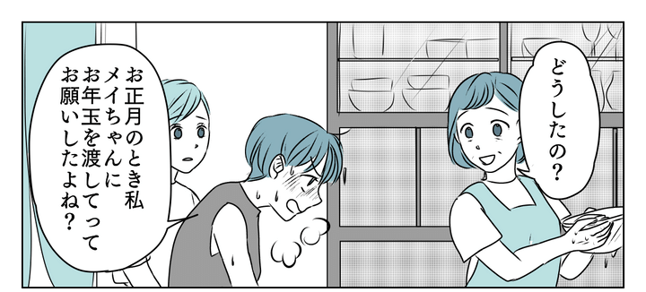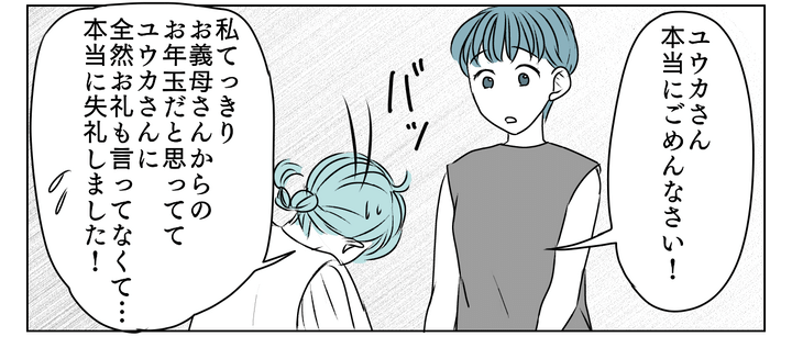 メイがもらったお年玉は、ユウカさんがくれたものだったのです。義母のうっかりで知らなかったとはいえ、ユウカさんには不義理なことをしてしまいました。私は心の底から謝りました。