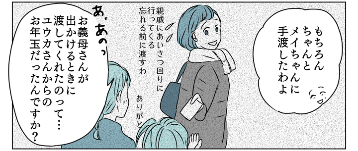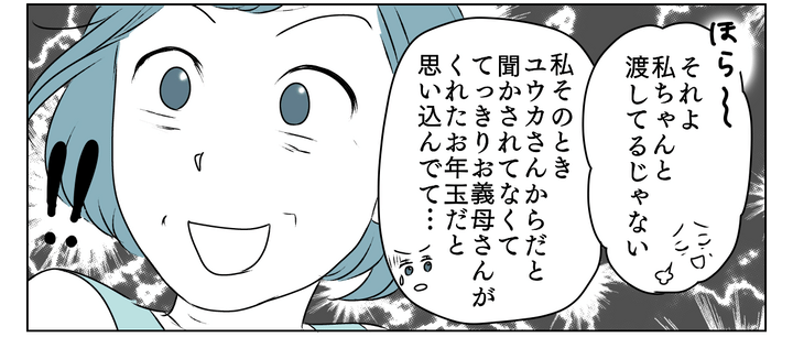 義母に詰め寄ると、義母は「やだ! 私、ユウカからのお年玉だって言ってなかった!?」と大騒ぎ。お年玉の件は、義母が伝え忘れたという「うっかり」が原因だと判明しました。