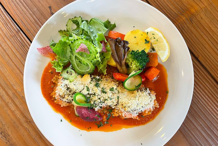 サーモン香草パン粉焼きは、カリッと焼かれたパン粉とふんわりサーモンの食感が絶妙。香草の香りが魚特有のクセをやわらげ、魚料理が苦手な方にもおすすめです。
