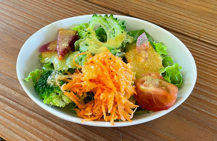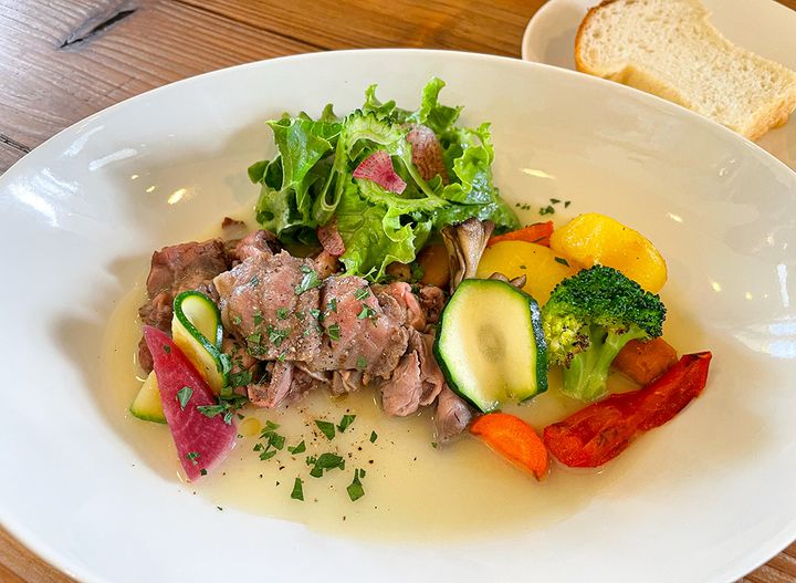 旬の野菜を使ったフレッシュなサラダ、ふわふわもちもちの自家製パン、そして食後のドリンクまで付いたランチは、心もお腹も大満足。