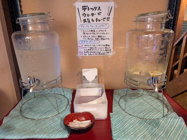 お水はセルフサービスで、お水とデトックスウォーターの2種類。 デトックスウォーターはフルーツやハーブなどが入ったお水。 フルーティーな香りも楽しめるお水でしたよ~。