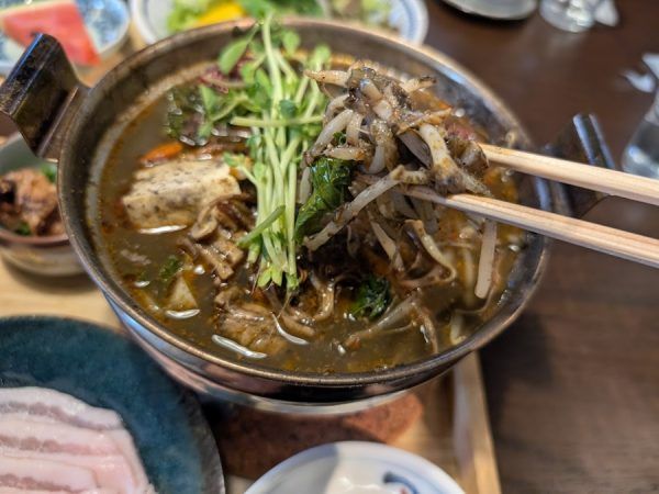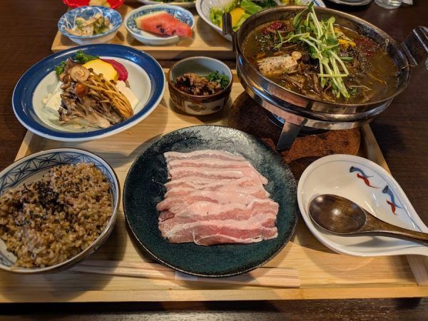 ごはんは酵素玄米ごはんですが白ごはんに変更もOK。 豚肉もたっぷり、鍋に入った野菜の他に別皿で野菜も盛られていて食べ応えばっちり。 真夏に熱々の鍋をフーフーしながら食べる醍醐味は最高です。