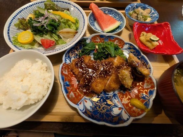 メインはサクッと揚げられたチキンカツ。 カラフルなサラダにゴーヤなど野菜の小鉢も添えられた定食となっています。 特に小鉢の焼き茄子はすだちでさっぱりとしていて真似したい一品。