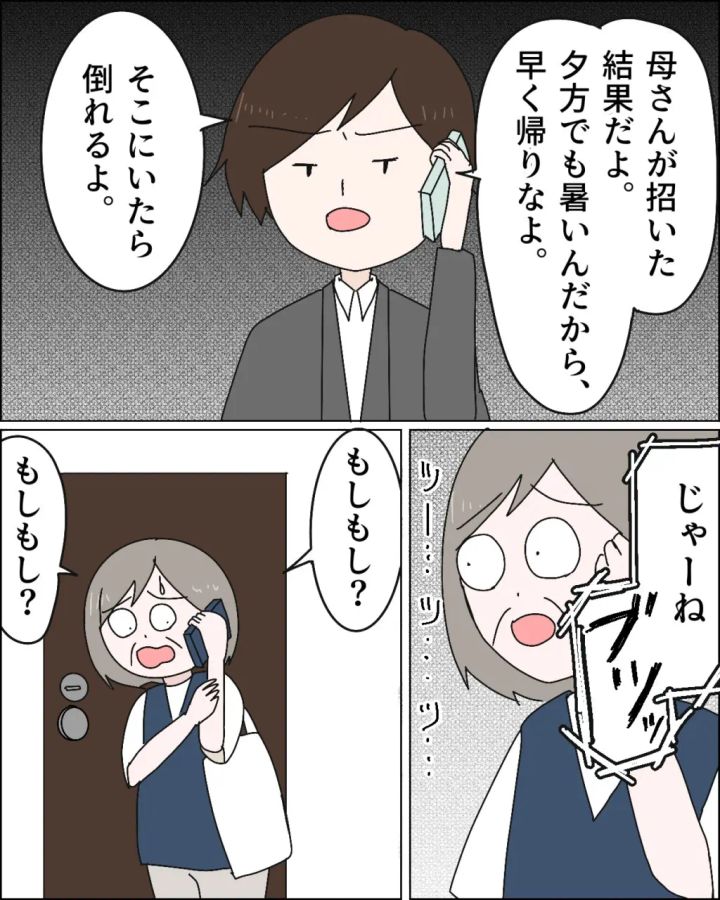 すると「母さんが招いた結果だよ。夕方でも暑いんだから早く帰りなよ。そこにいたら倒れるよ。じゃーね」そう言って電話を切ってしまったヒロム。義母は「もしもし?もしもし??」何度も何度も繰り返し呟きました。