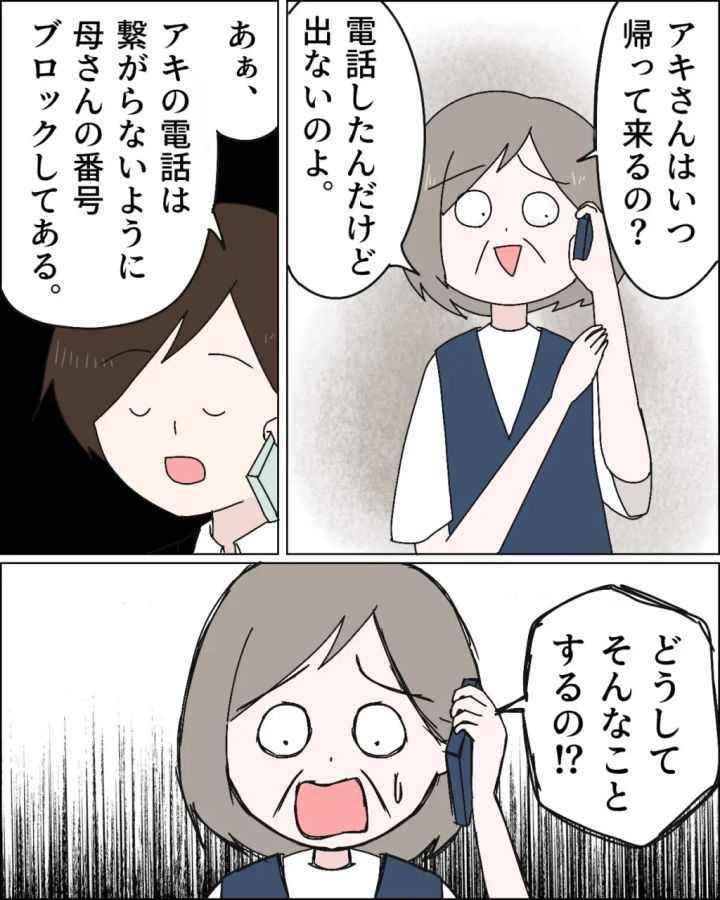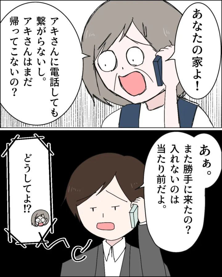 ある日のこと。ヒロムさんに電話をかけてきた義母が「家に入れないの!」と言うと、「誰の家?」と驚きもせず冷静に言いました。「あなたの家よ!」と言われて呆れたヒロムさんは、「鍵を変えたからに決まってるでしょ?」と言うと、アキさんはいつ帰って来ると言い出し、義母からの電話はブロックしてあると言うと、大慌ての義母は、ヒロムさんが切った電話に向かって「もしもし?もしもし?」と何度も繰り返したのでした。