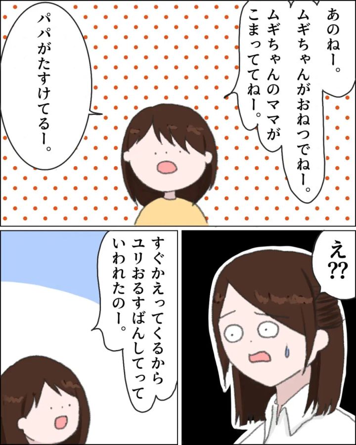 すると、「あのねー。ムギちゃんがおねつでねー。ムギちゃんのママがこまっててねー。パパがたすけてるー」とユリが言い出し、「え??」と言うと、「すぐかえってくるからユリおるすばんしてっていわれたのー」ユリの言葉を聞いて、