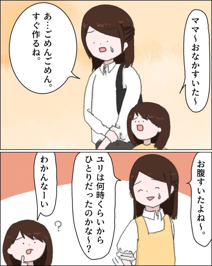 「ただいまー」ドアを開け家に入ると、「ママ~おかえり~。おなかすいたー」とユリが玄関までやって来たのを見て、「え!?ユリひとり!?パパは?」とビックリ。