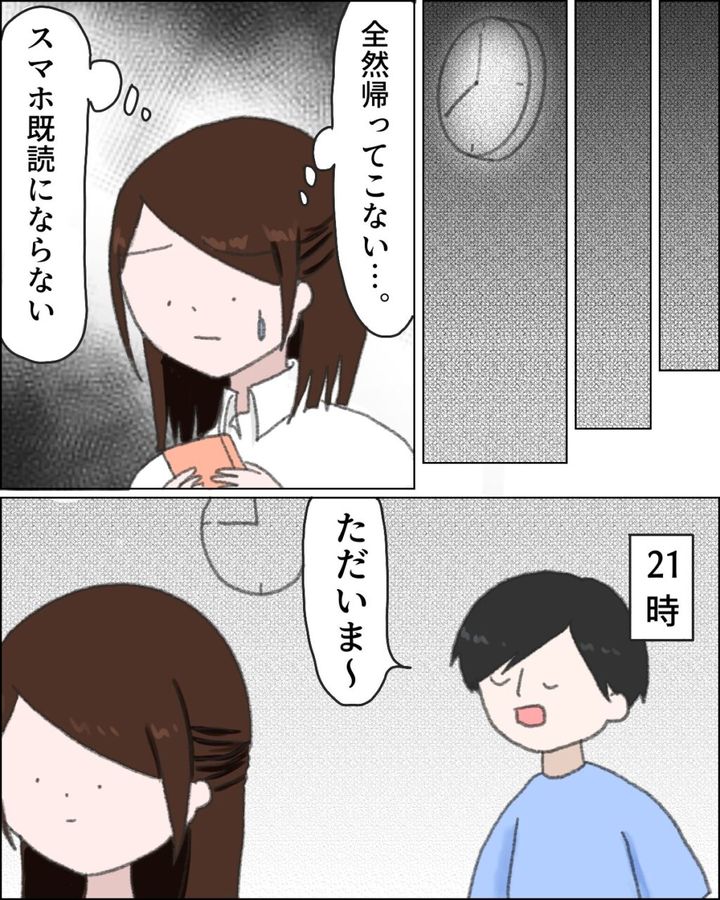 それから食事をし、時間が過ぎても夫が帰って来る気配はなく・・「全然帰ってこない・・スマホも既読にならない」と思っていると、21時すぎになって「ただいま~」夫が平然と帰ってきました。