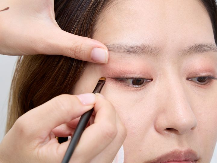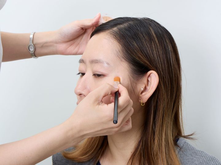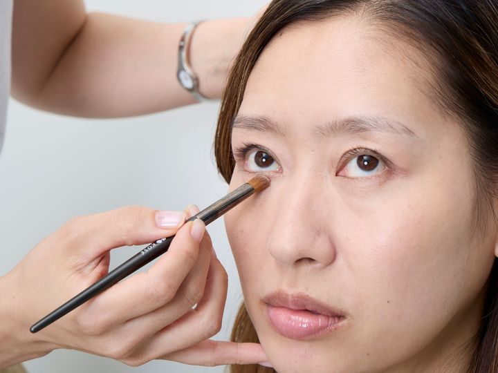 目元では、涙袋にパウダーをオン。コンシーラーを塗った部分は油分が多いので、その部分にパウダーを重ねることでヨレを防げるのだそう。また、涙が溜まりやすい目尻や下まぶた、目頭にアイシャドウブラシを使ってパウダーを仕込むと、アイラインなどの滲みなどを抑えられるといいます。