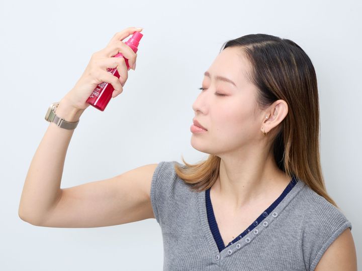 二つ目が、15cmほど離して満遍なく5〜6プッシュ全顔に吹きかけることです。メイクを崩さないために少量にしなきゃと思いがちですが、しっかりと顔全体に行き渡らせることでメイクよれを防ぐことができるのだとか。最後に、肌に触れず乾かすことで、より効果的にメイクキープができるといいます。