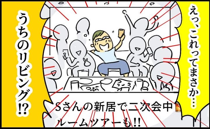 35歳の友人は、新居に引っ越して間もなく、出産のため長女を連れて実家に里帰りすることになりました。そのとき夫は、職場であったBBQの二次会会場として、友人の許可なく新居に10人ほどの同僚を招いたのです。そればかりか、新居のルームツアーもしていたことが発覚。とある理由で事情を知った里帰り中の友人は怒り心頭。上機嫌だった酔っ払い夫にも暗雲が漂い始めます。